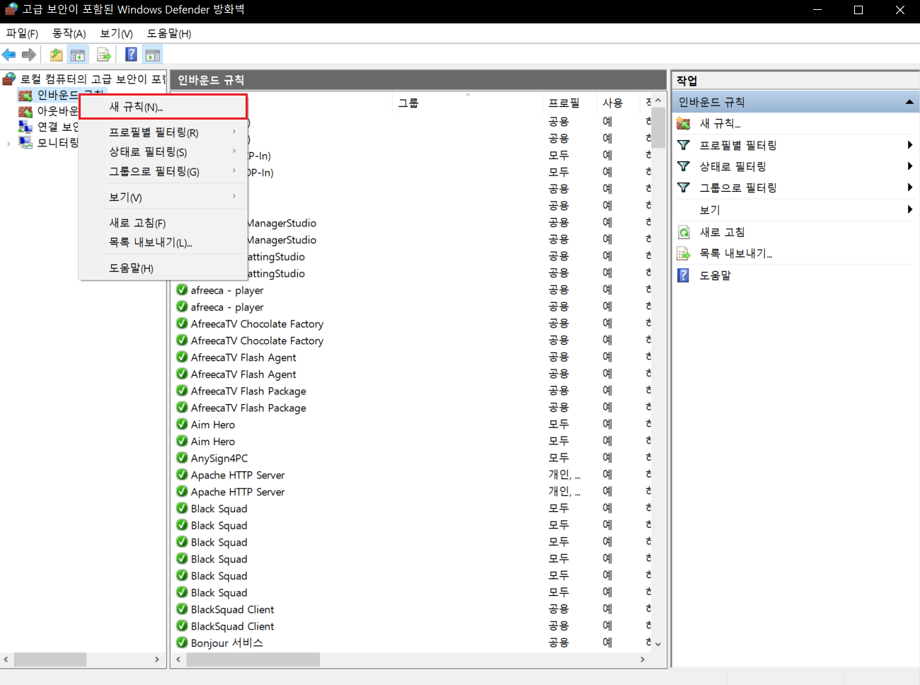 2. 인바운드 규칙에 마우스 오른쪽 버튼을 누르고 '새 규칙'을 클릭합니다.