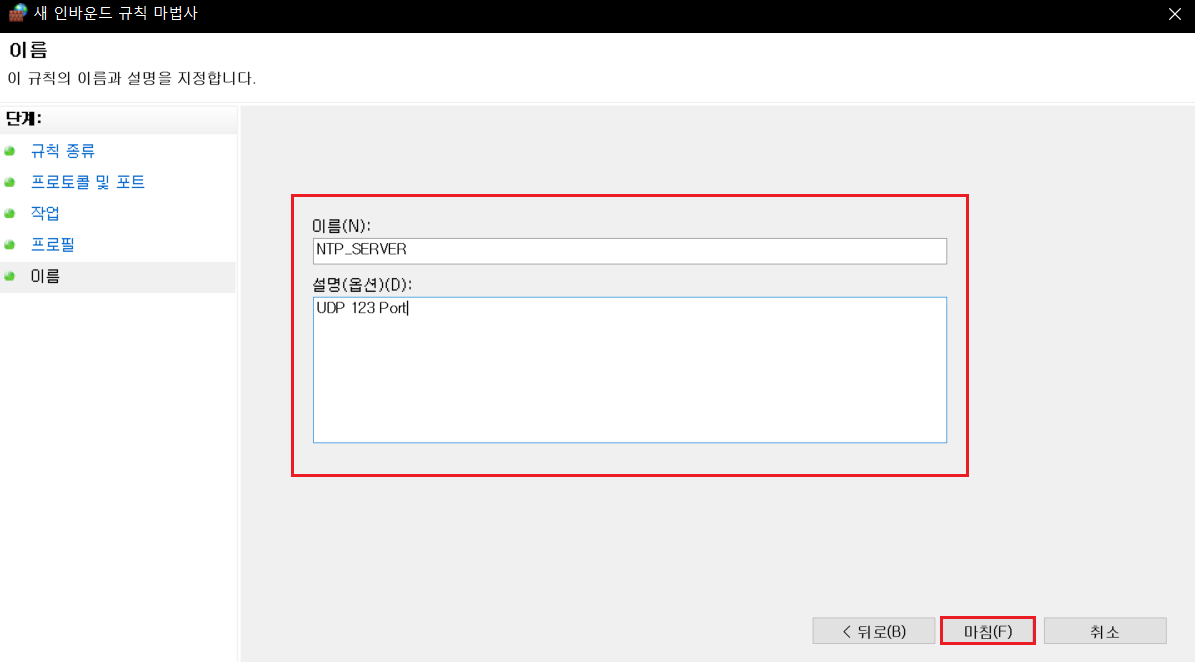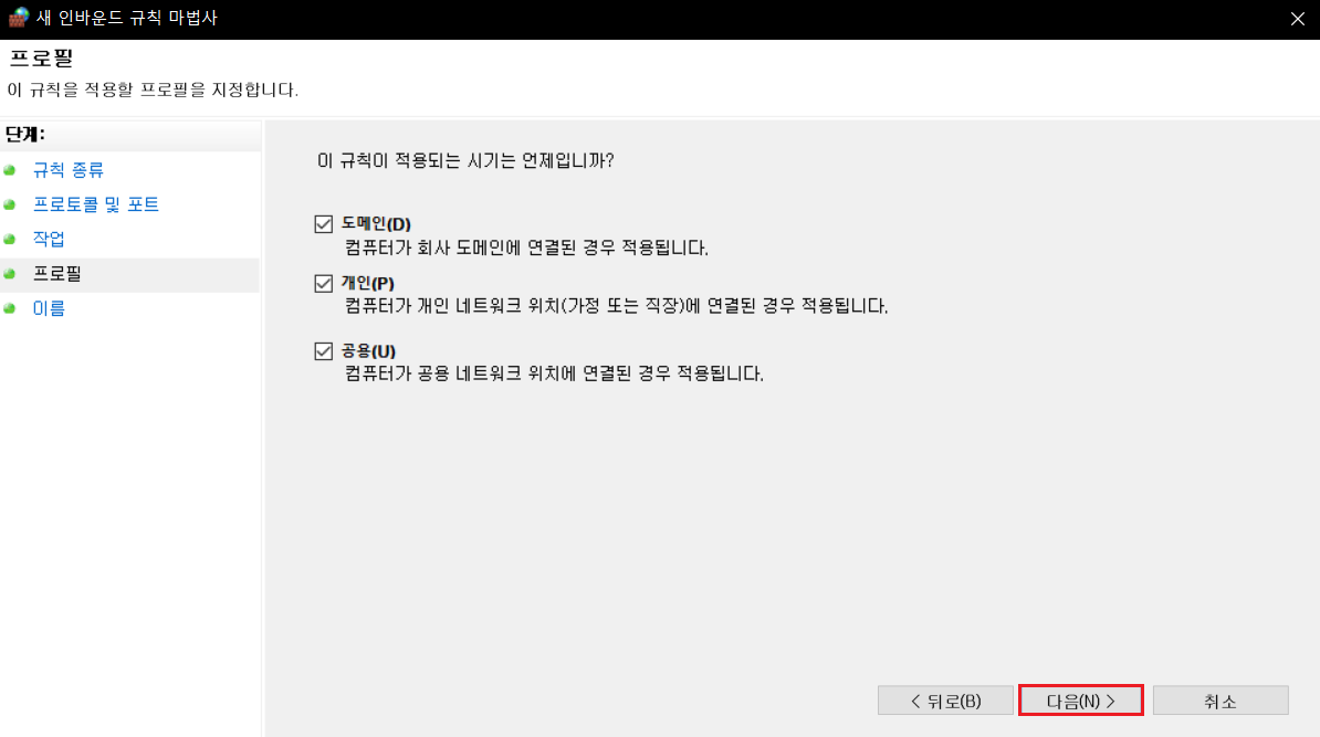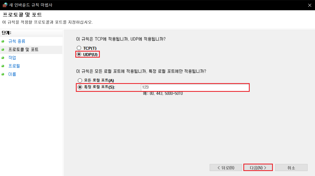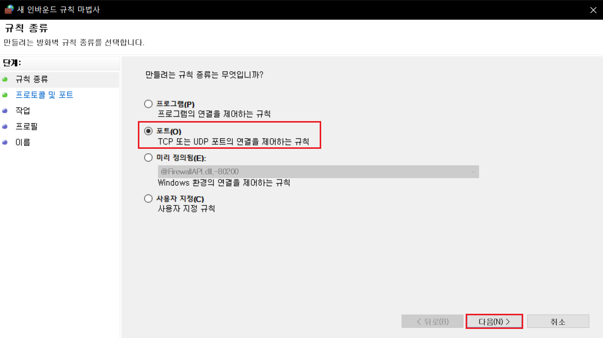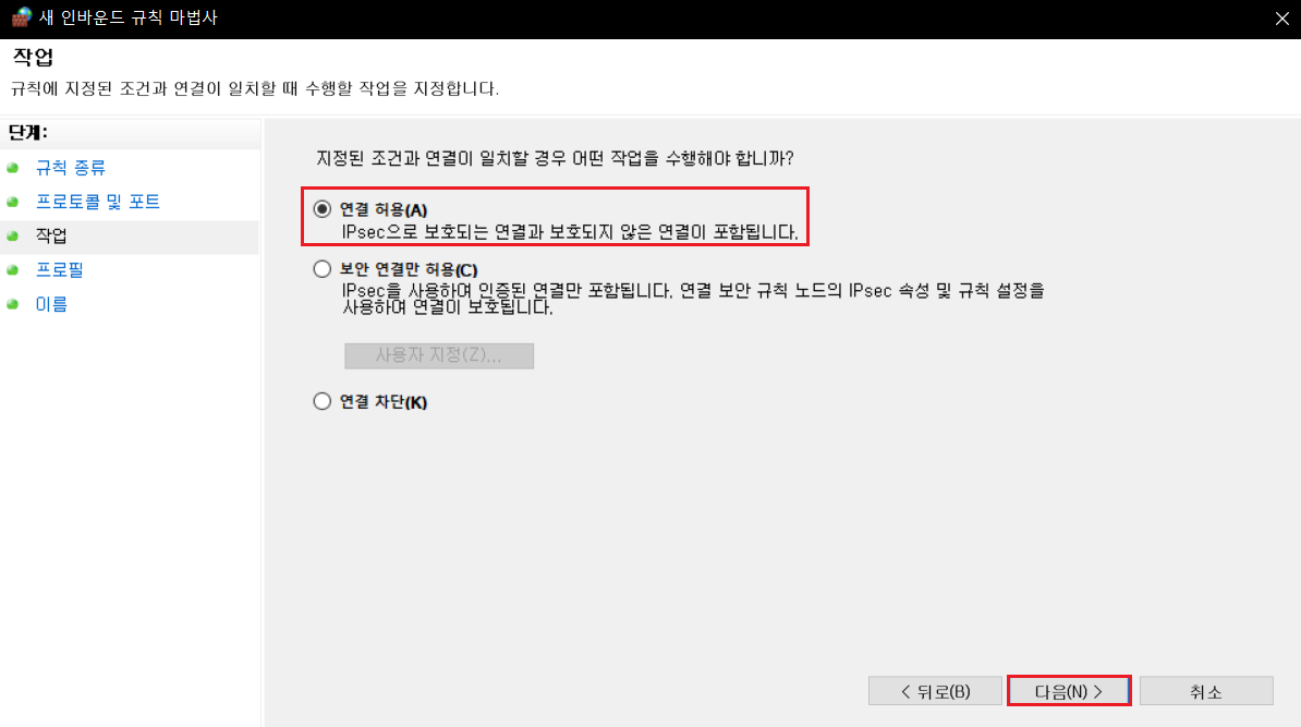 3. 다음과 같이 따라하여 새 인바운드 규칙을 생성합니다.