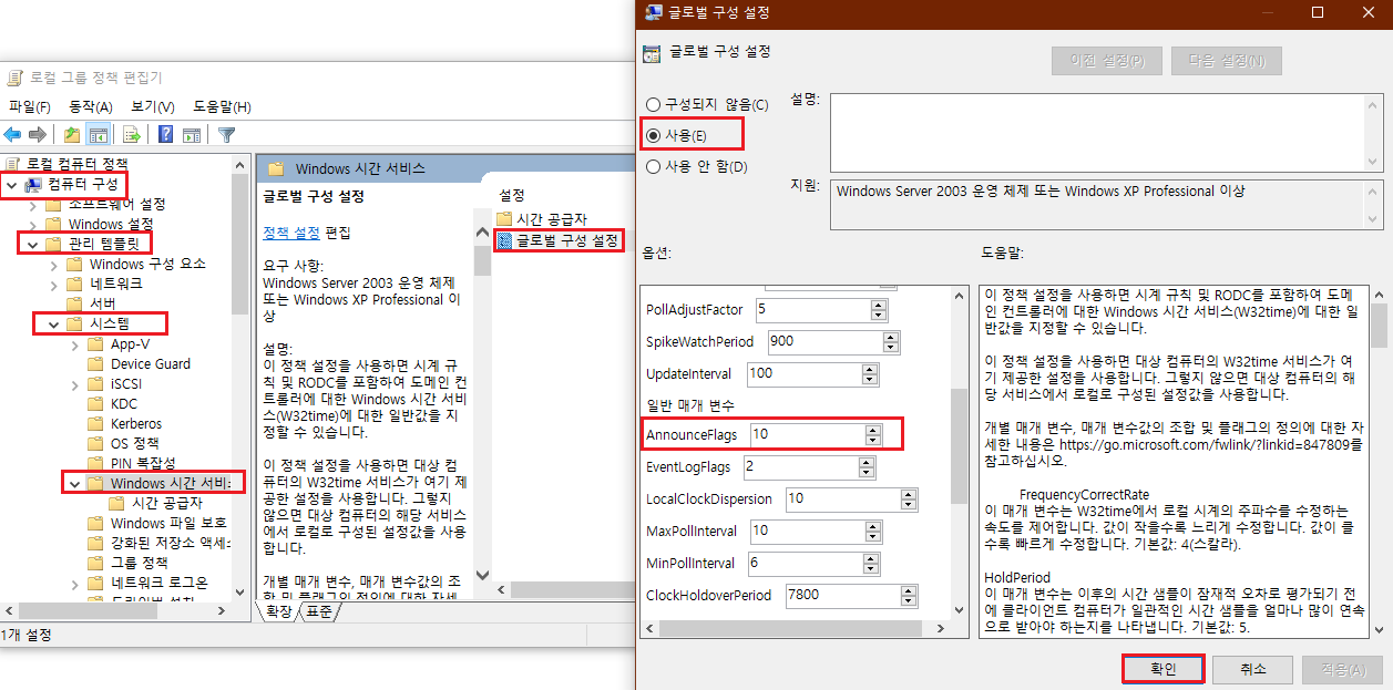 컴퓨터 구성 - 관리 템플릿 - 시스템 - Windows 시간서비스 - 글로벌 구성