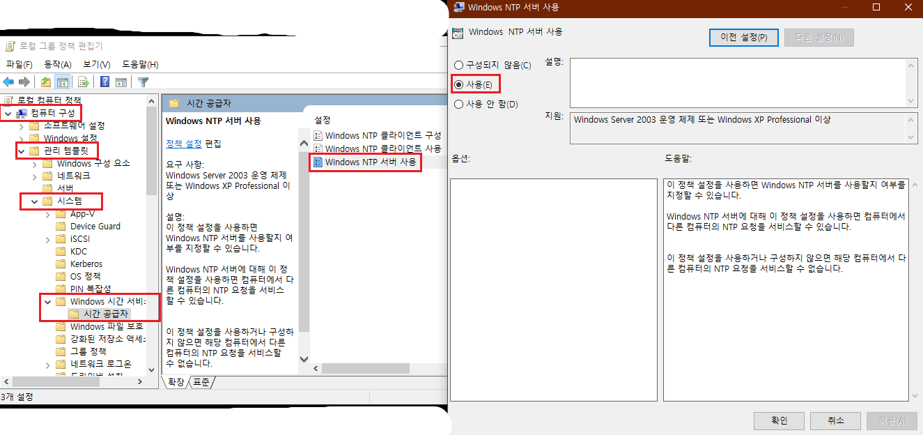 4. gpedit.msc를 실행하여 컴퓨터 구성 - 관리 템플릿 - 시스템 - Windows 시간서비스 - 시간공급자 -