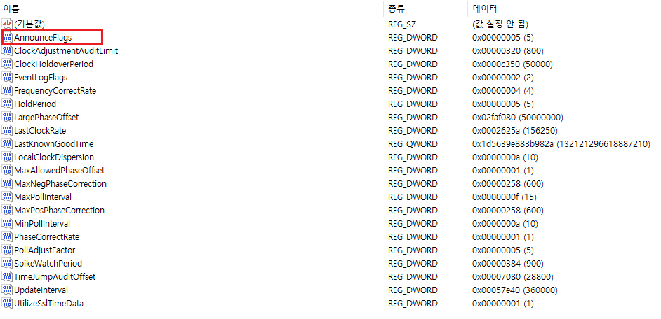 6. 귀찮다면 레지스트리에서 바꾸셔도 됩니다. 다음 경로 AnnounceFlags 값과 Enabled값을 5와 1로 바꿔줍니다.